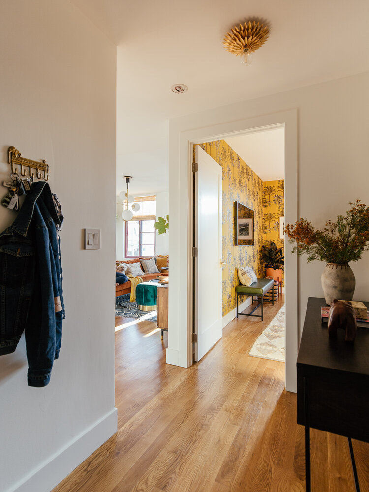 To kickstart the makeover I started with the space you immediately notice when you walk in: the entryway. Here are some before photos. This is a part of the home I think often gets neglected, but because it’s the first thing you see, I believe it should feel welcoming and functional at the same time. Like most entryways in NYC, Sophia and Rana’s is long and narrow, and theirs can quickly fill up with clutter, especially since they love stuff. So we knew storage had to be a major component of this transformation.